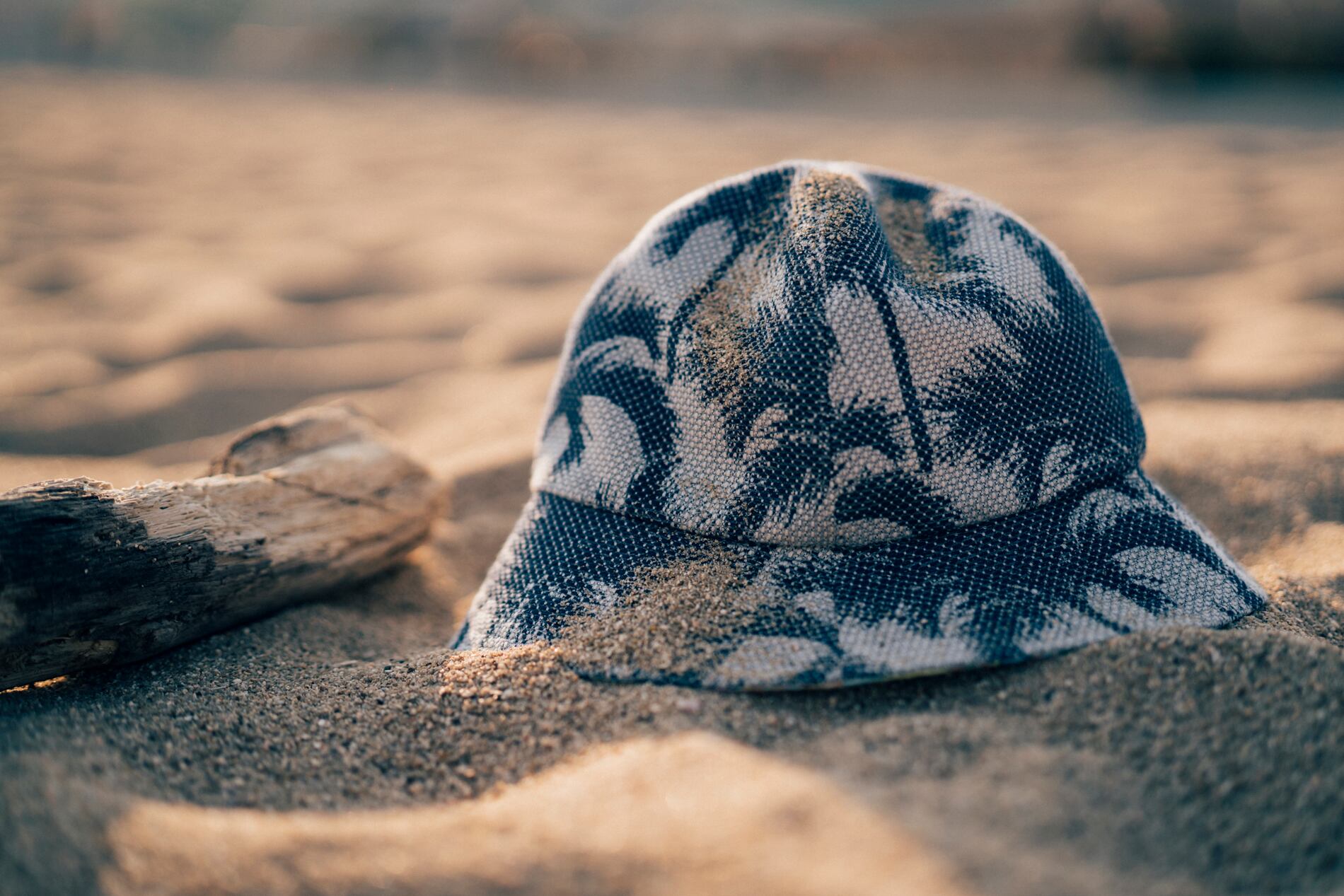 ボタニカル柄の麻ボイル(リネン)素材と、日本の伝統的な手法の一つである刺し子の技法を用いたパーム柄のコットン生地でデザインしたチューリップハット。